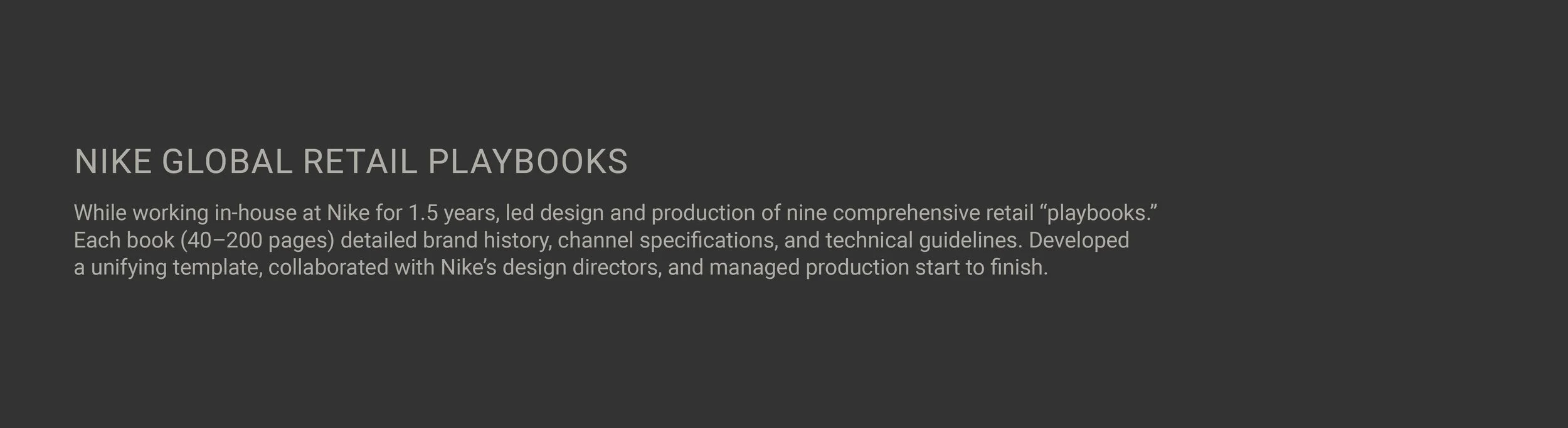 For 10 years, I served as creative director on Nike’s U.S. retail account through Culminate. I led design work that translated Nike’s global campaigns into immersive, high-end retail experiences across the company’s owned stores—from flagship concept locations to elevated community-based spaces. My team and I adapted campaign storytelling into custom 3D displays, window graphics, environmental systems, motion graphics, and product signage that integrated seamlessly with Nike’s retail fixture standards.